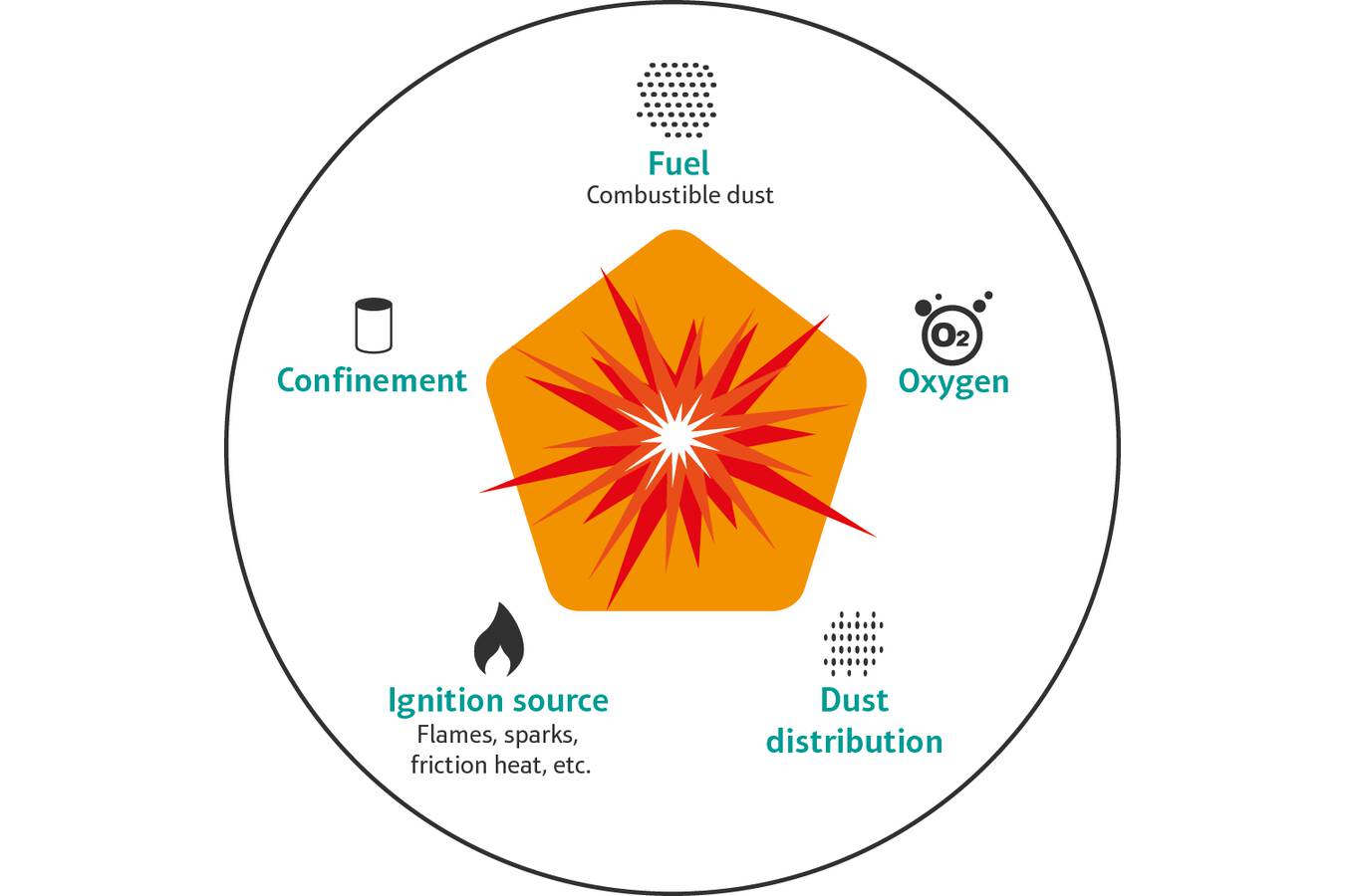 To help minimise the risk of explosions when handing combustible dusts, it is important to understand the requirements for an explosion and the respective dust safety characteristics, which are described below. The following picture shows the fire triangle and the explosion pentagon which must be taken into account.