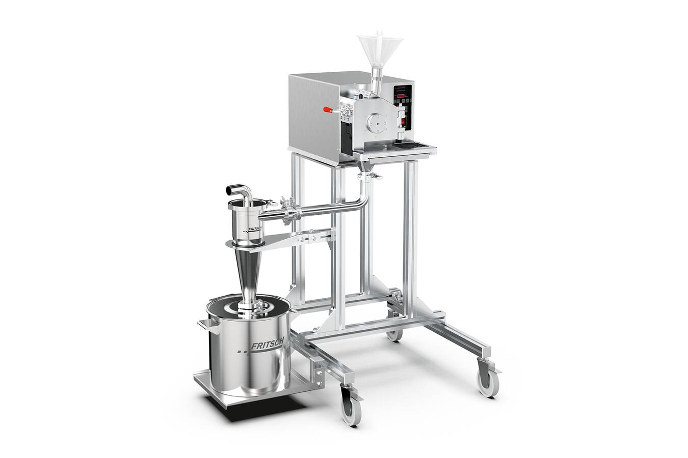 The connection to a FRITSCH high-performance or small volume Cyclone separator ensures simple feeding and cleaning, higher final fineness and faster throughput with minimized thermal load of the samples.