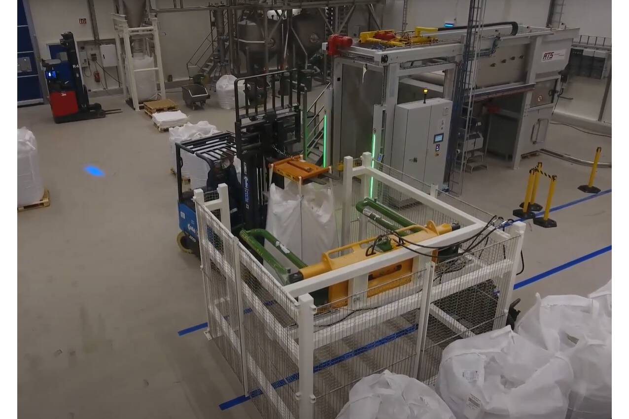 The big bag crusher semi-automatic can be operated as following: a big bag hang with its loops on a forklift and is loaded into the crusher form the top. The crushing usually starts from the top and moves its way down to 4 to 5 places distributed over the height of the bag, the forklift thus lowers the big bag downwards. A crush movement of the big bag crusher lasts approximately 10 seconds. This cycle may be repeated after rotating the big bag 90 degrees , this ensures that all large chunks in the big bags are broken.