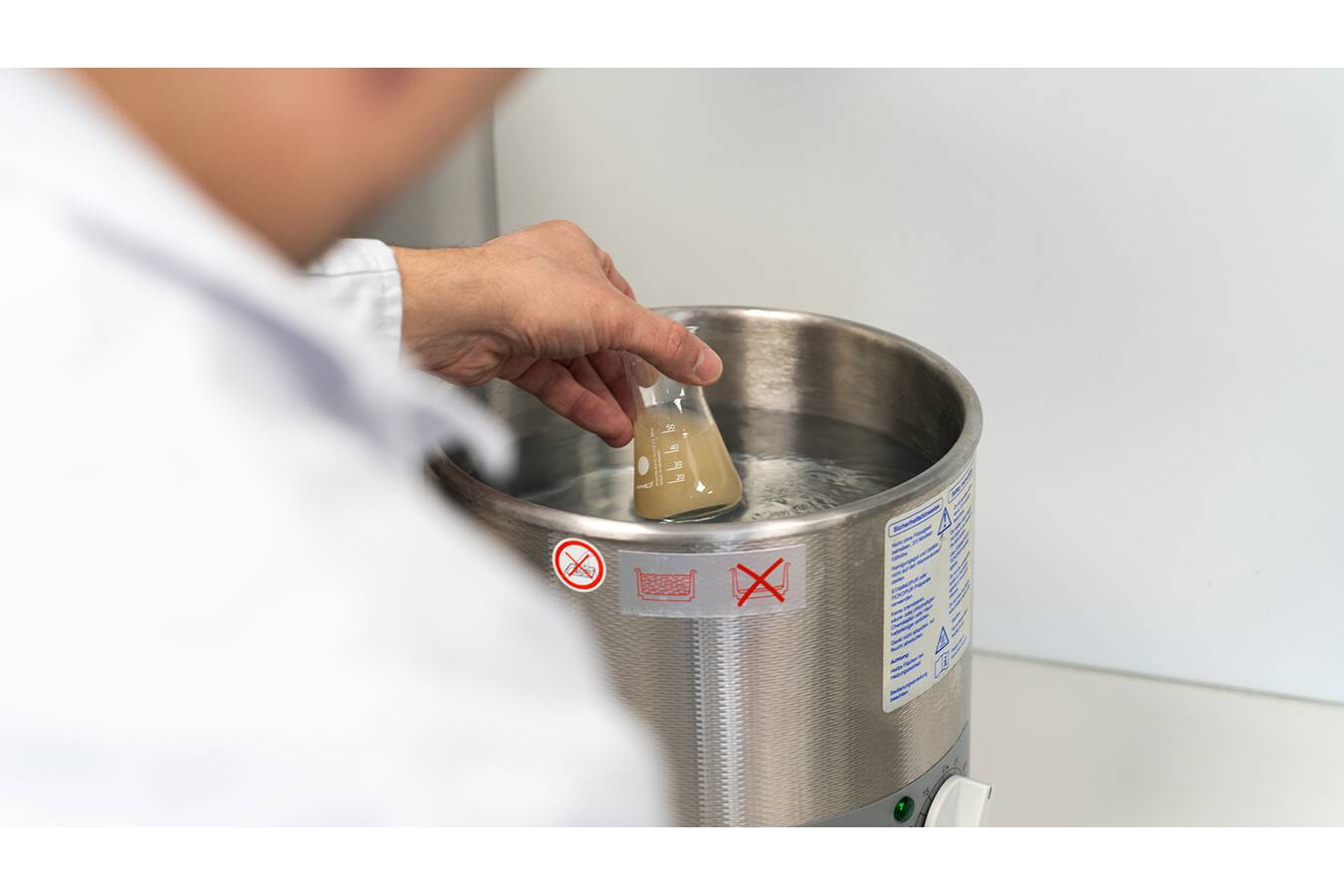 The now available approx. 20-30 ml suspension is dispersed in the ultrasonic bath. If the sample is already in the dispersion unit and floats on the surface, the sample can still be wetted as follows: a small drop of a wetting agent (e.g. Dusazin 901, Teepol, Tween 80 or dishwashing detergent) is applied/touched to the liquid surface with a glass rod or the tip of a spatula and distributed. It is immediately noticeable that the formed skin breaks open and the fine particles go into suspension. This is followed by treatment with ultrasound in order to support the chemical effectiveness of the above-mentioned surfactants physically.