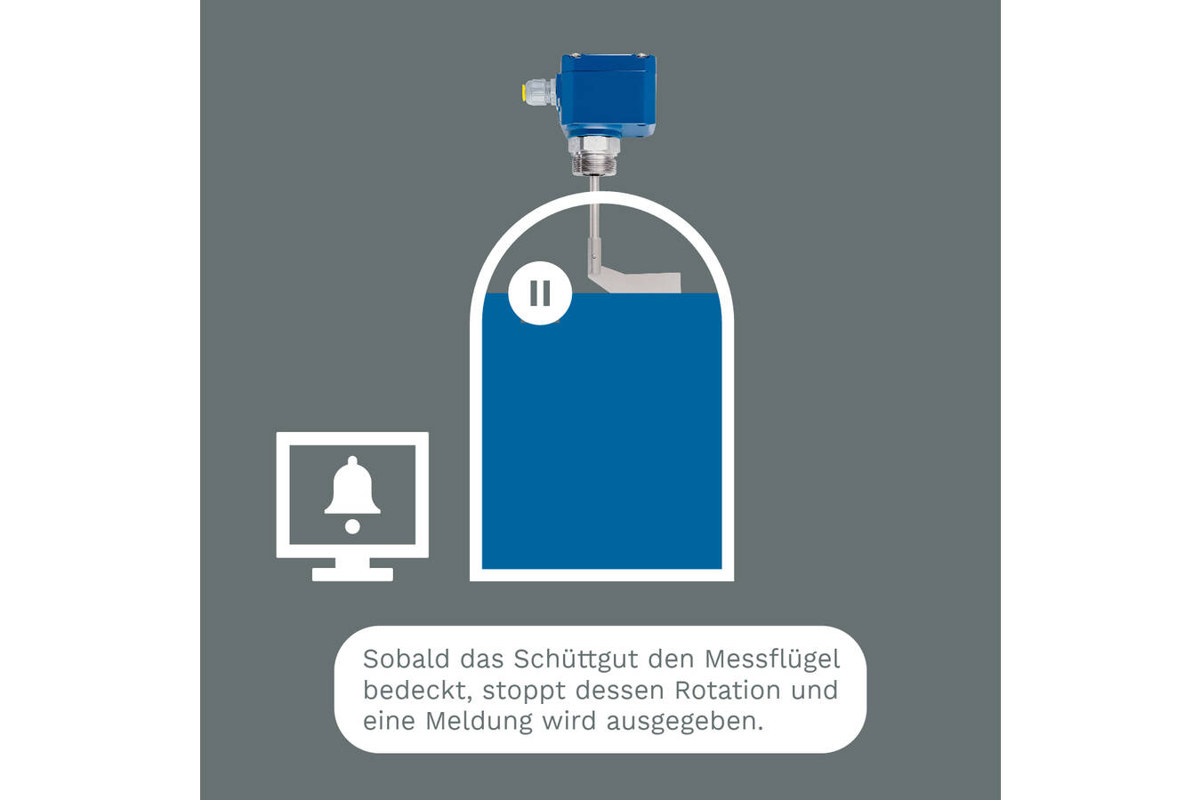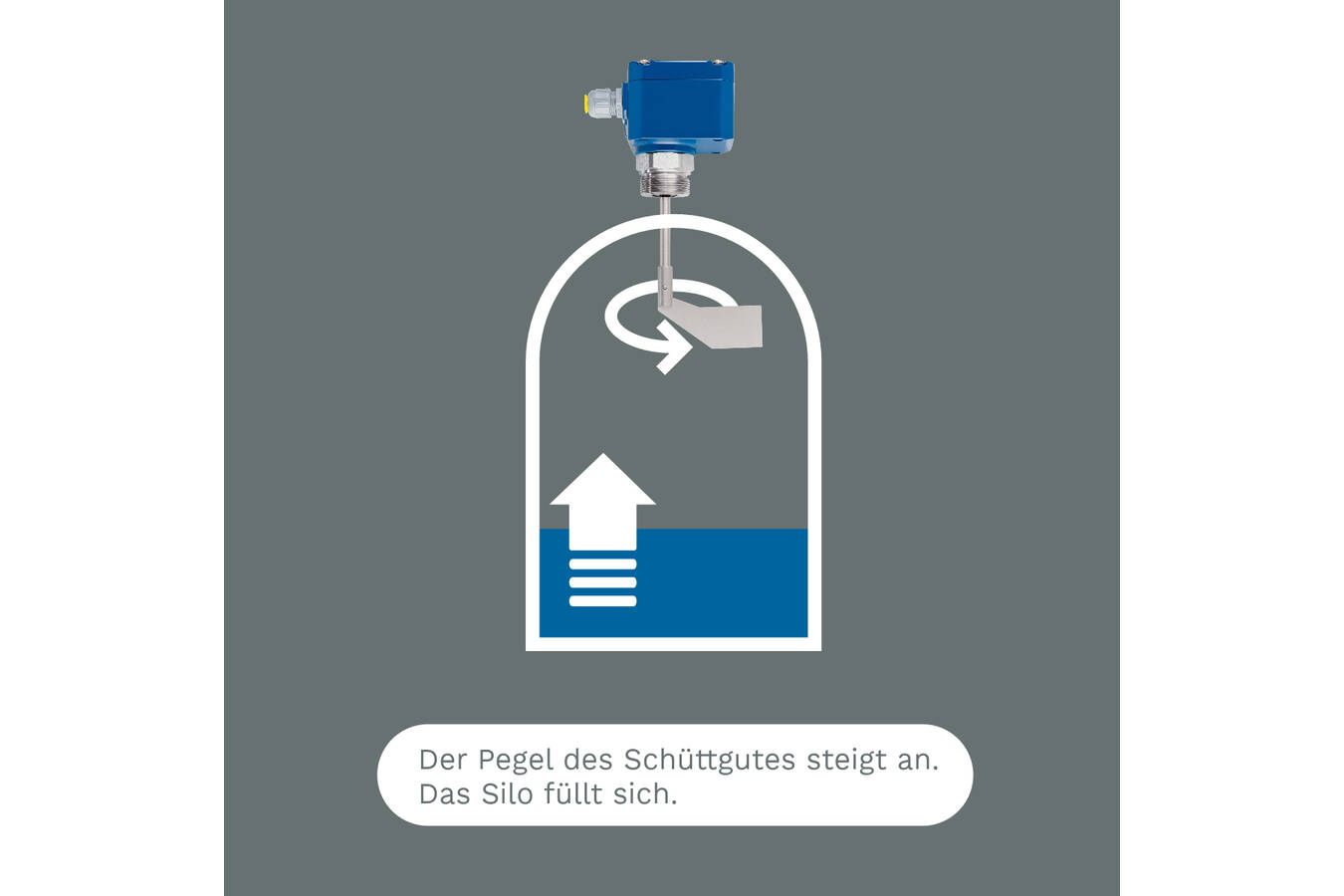 Depending on the requirements, the Rotonivo® rotary paddle switch is used as a full, demand or empty detector in storage silos or process vessels and is suitable for use in almost all solids. With its simple electromechanical measuring principle it can also be adapted for extreme process conditions. A motor driven shaft causes the vane to rotate. Once the material level reaches the vane, thereby preventing further rotation, this creates a torque, which is converted via a switch to an electric signal. Once the vane is free again of the material, the output signal is reset and the motor driven shaft rotates again.