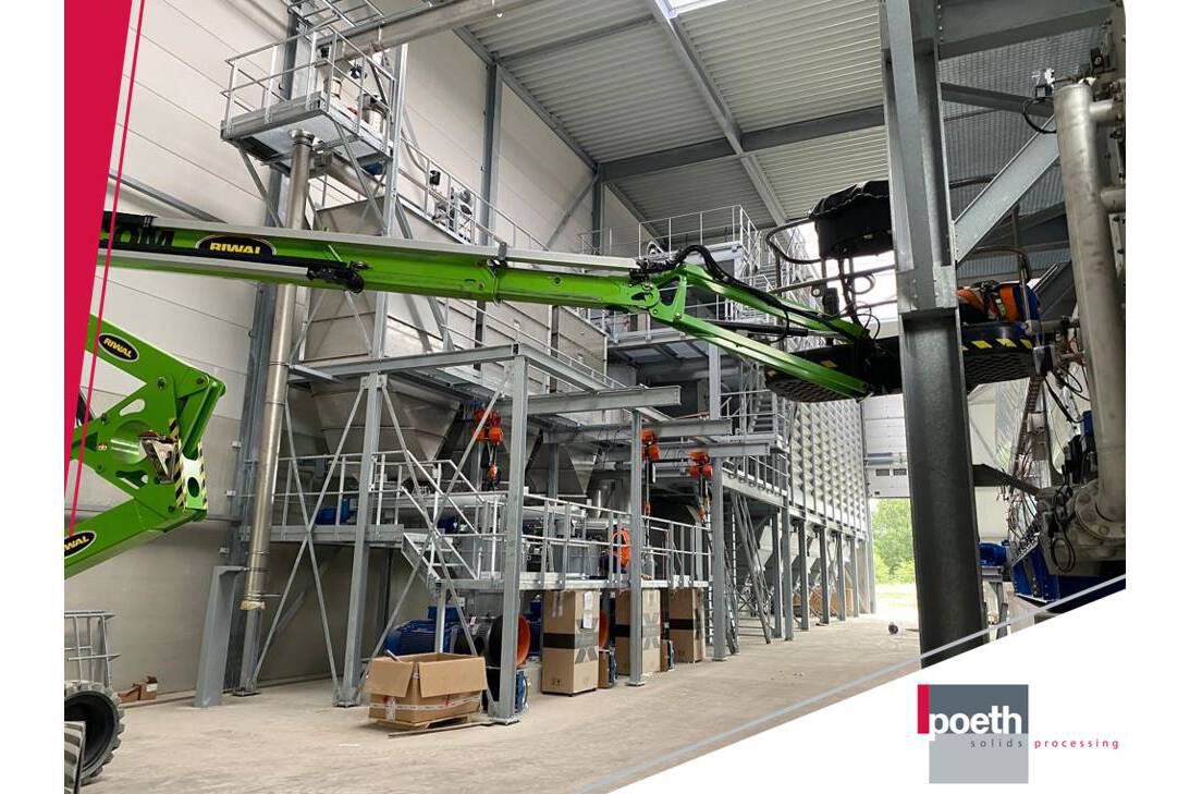 The hall consists of three parts and has an area of 2,000 m² and will be 15 metres high. In the middle part, the digestate will be separated and the thin fraction purified into dischargeable water. A second part is used for drying the digestate and processing it into granules, which also houses Poeth’s scope.