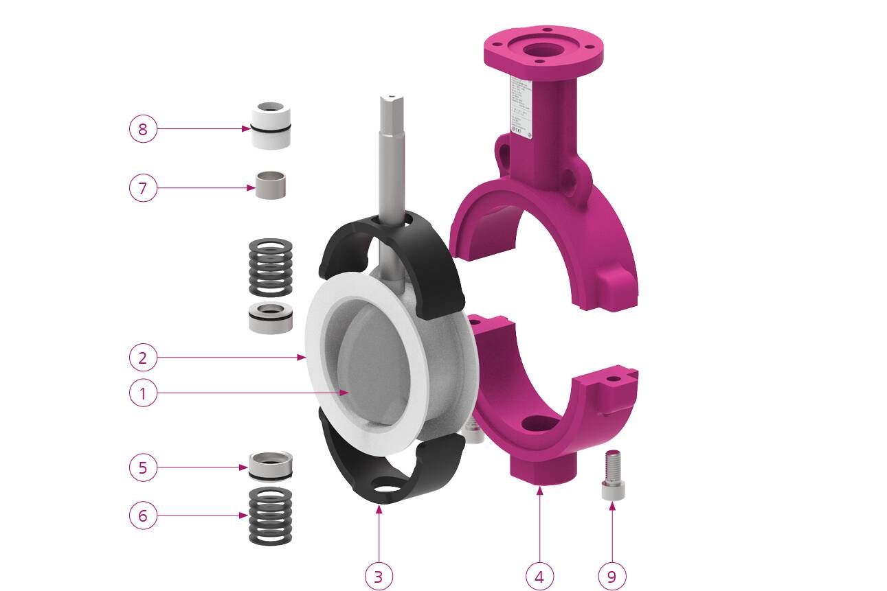 The ChemFlyer | CST offers smooth functionality when used with corrosive media and plenty of scope for modifications. These result from the advantageous design: the rounded and polished sealing surfaces of the disc reduce the torque and allow the use of smaller, less expensive actuators and extend the service life. The one-piece disc, which is precisely dimensioned to a tenth of a millimetre, remains securely anchored in the valve. The injection-moulded elastomer inserts ensure maximum tightness. The ChemFlyer | CST has a modular design from the ground up and is individually traceable with a serial number.