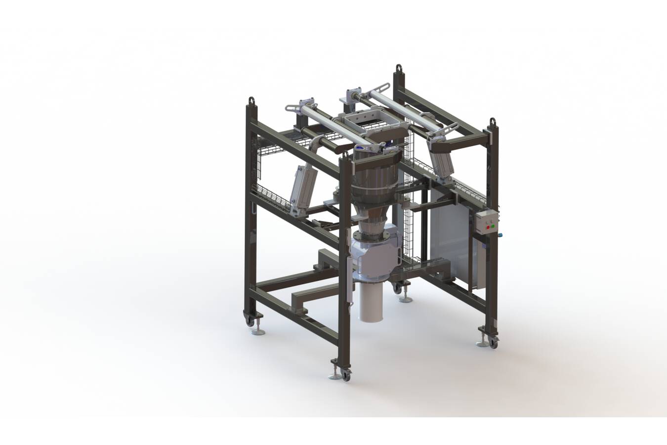 The big bags are made available via an integrated crane system, after which the discharge hose is connected dust-tight to the docking unit of the emptying station. Containers with different dimensions can be emptied by quickly changing the moulded parts on the docking unit. Dust generated during the big bag change or during the emptying process is extracted via an aspiration system so that neither the operating personnel nor the environment are exposed.