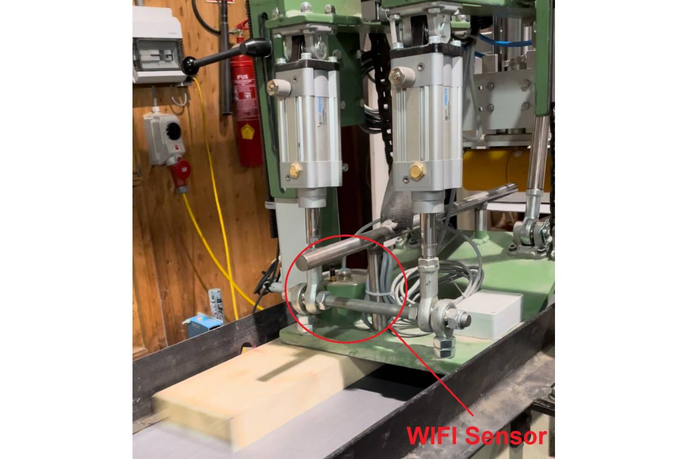 In this approach, two pneumatic cylinders press the sliding carriage, which is equipped with an integrated microwave moisture sensor, onto the surface of the beam. This setup allows the beam to be transported smoothly under the measuring device while maintaining contact with the sensor. Additional inductive proximity switches optimize the measuring device by controlling the ideal timing for actuating the pneumatic cylinders.
