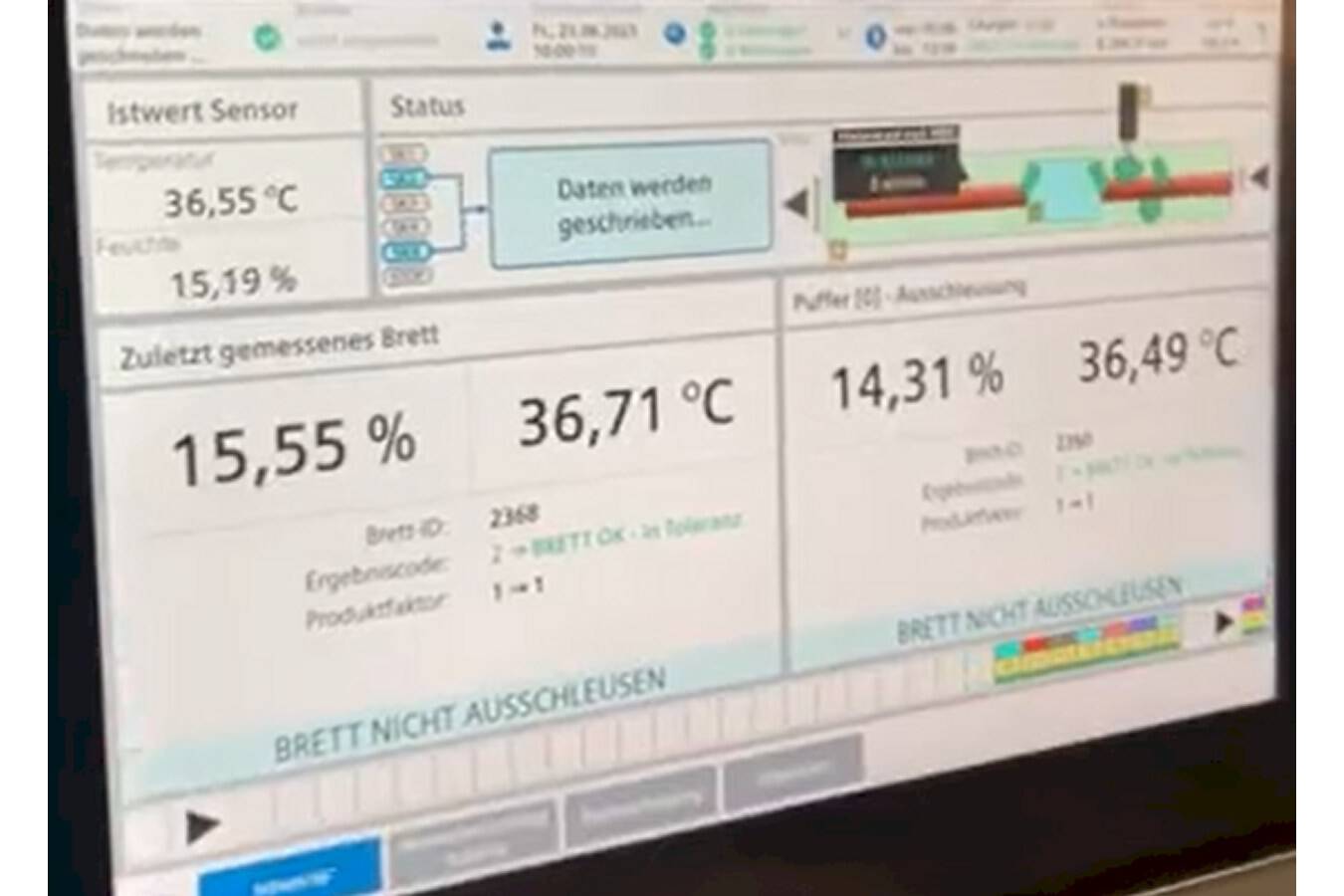 This method ensures proper contact of the sensor with each wooden beam, piece by piece, in seconds, as shown in Image 2. The obtained measurement data is recorded by a Siemens PLC and documented, as shown in Image 3. It is also determined whether beams with excessively high moisture content need to be sorted out for an additional drying process.