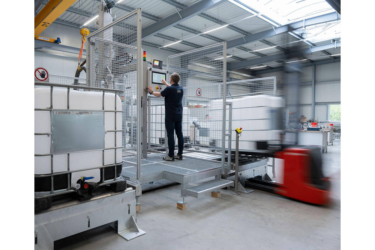 The filling accuracy is approx. 0.5% for 1,000 liter IBCs and a throughput of 20 IBCs per hour. On the second turntable, the labeling machine applies the label with net weight, order, and batch number to the IBC. The IBC is ready for transportation.