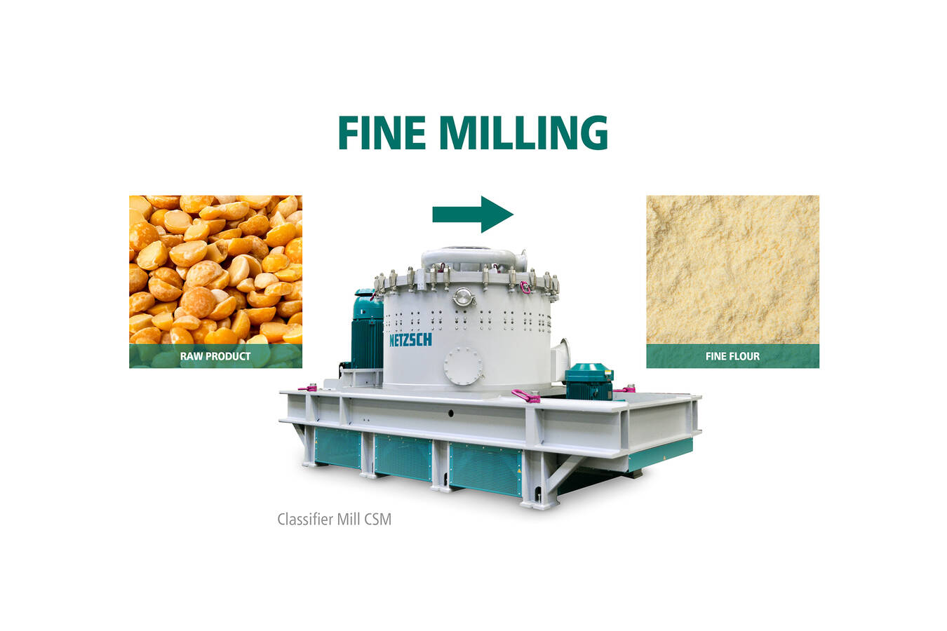 The process starts after the cleaning and dehulling step of the legumes. The milling disaggregates the relatively large starch bodies from the smaller protein parts. Furthermore, the damage of starch should be avoided to keep its quality. The most effective and gentle way to achieve this is through impact grinding in a NETZSCH Classifier Mill CSM. A fineness of around 40 – 60 µm (d90) of the obtained flour is ideal.