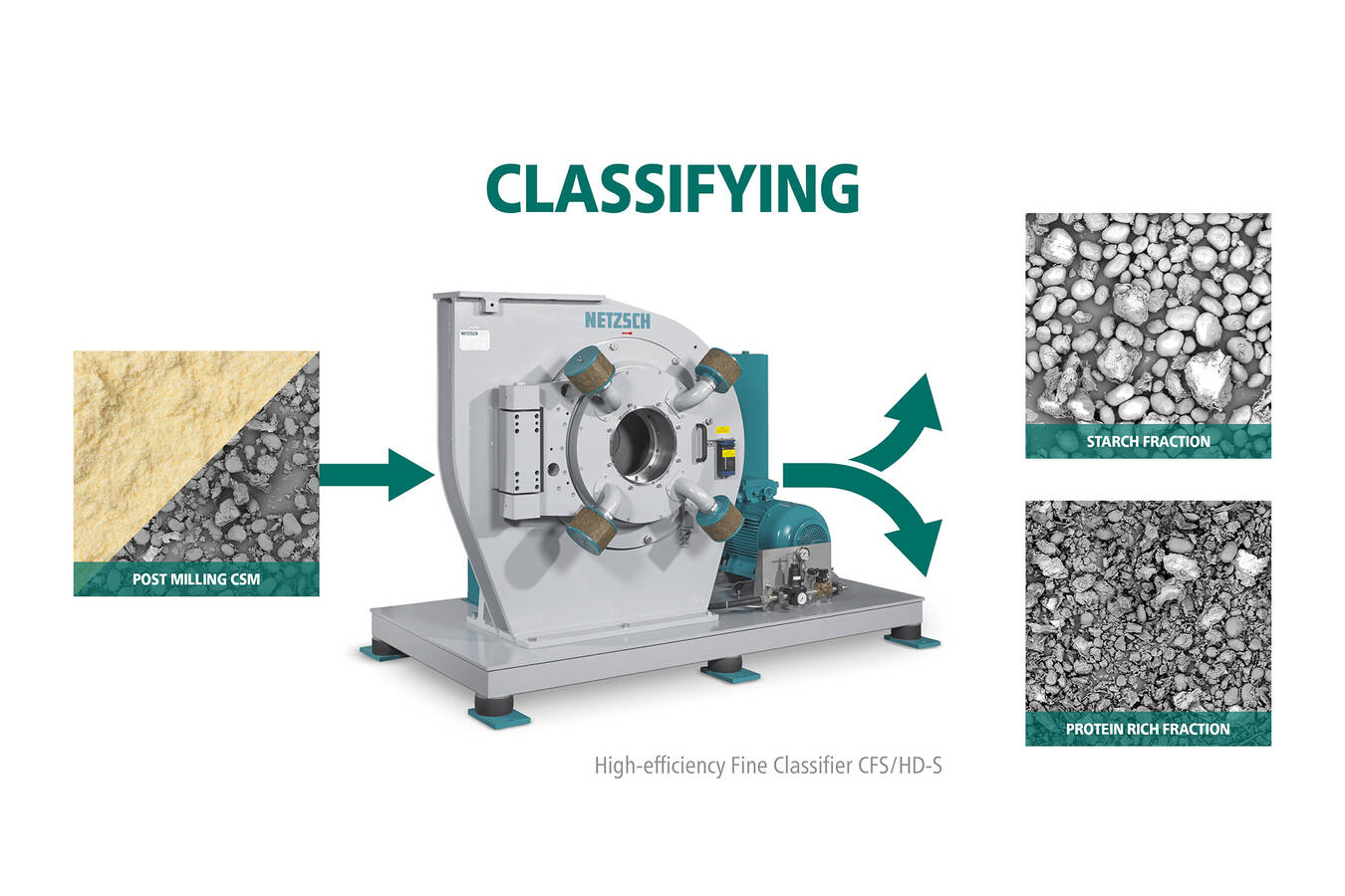 But due to ongoing developments in dry fractionation technologies and seed breeding, the process has become an energy-efficient method to produce high-quality protein concentrates with significant lower plant investment as wet technologies. The goal is to achieve a protein-rich fraction with a significantly higher protein content than the original material through dry grinding and air classification.