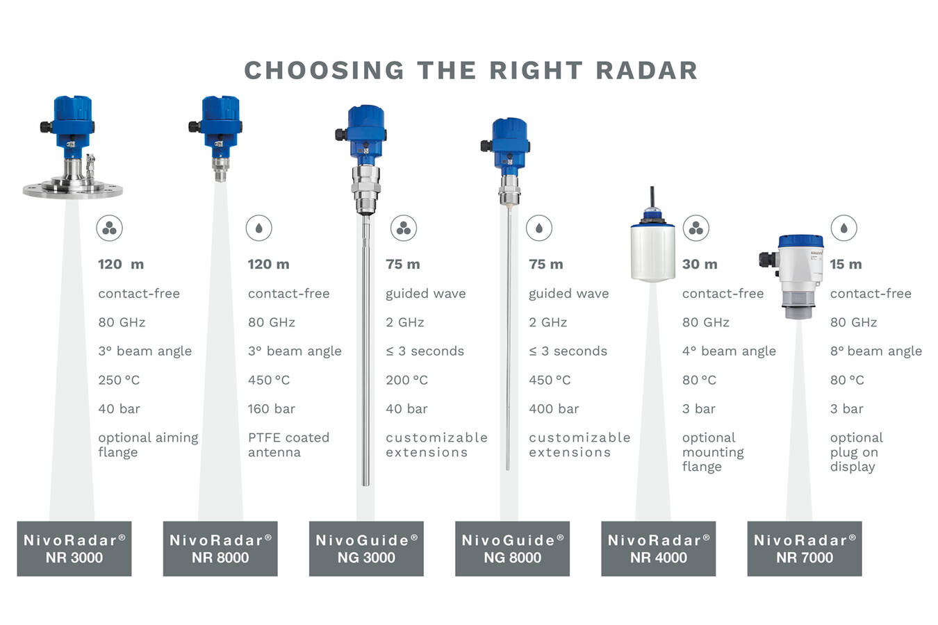 Both series feature a high dynamic range, ensuring accurate measurements even with low-dielectric materials. The 80 GHz technology and narrow 3° beam angle provide precise results, even in nerrow silos, with a measurement range of up to 120 meters (393 feet).