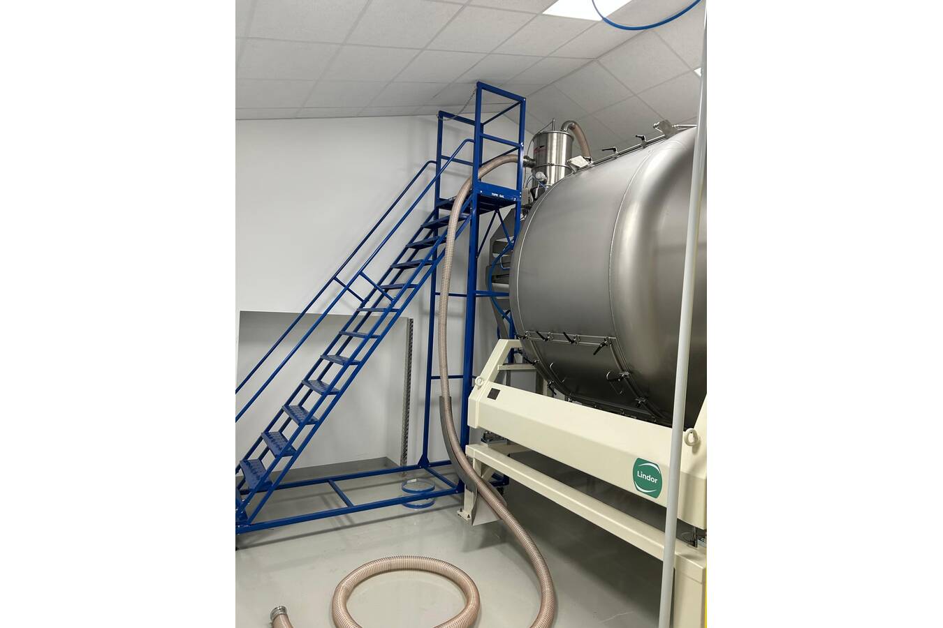 The installation boasts an advanced vacuum transport system, which conveys the product into the mixing drum. The raw, bagged product is loaded into a sieve to remove lumps, and from there, a flexible pipe pumps the sieved product into a 40-liter receiving hopper, which then drops it into the mixing drum.