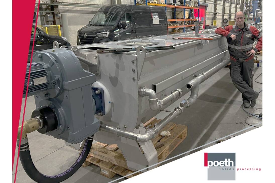 Poeth has introduced a cutting-edge mixing plant in Nazareth Belgium, delivering exceptional efficiency and meeting the highest quality standards. Having recently completed a successful project for baking ingredients, Escaut Valley quickly opted for Poeth’s expertise. The project required a solution that could accommodate limited height and minimize the number of components and machines. Poeth addressed these challenges with a well-thought-out design, focusing on clean-ability and accessibility. Ingredients are conveyed pneumatically from a bag emptying cabinet to the mixer, while a check weigher ensures precise batch contents. A vibrating sieve and metal detector guarantee the mixture is free from foreign bodies. Testing and commissioning The test facility at Poeth features a twin-shaft paddle mixer with liquid addition. Atomized nozzles finely distribute the liquid over the fluidized powder bed, achieving a dry mix homogeneity of 1:100,000 within 50 seconds. Thanks to meticulous preparation during the engineering phase, the assembly and commissioning were completed swiftly. Quality through leading-edge