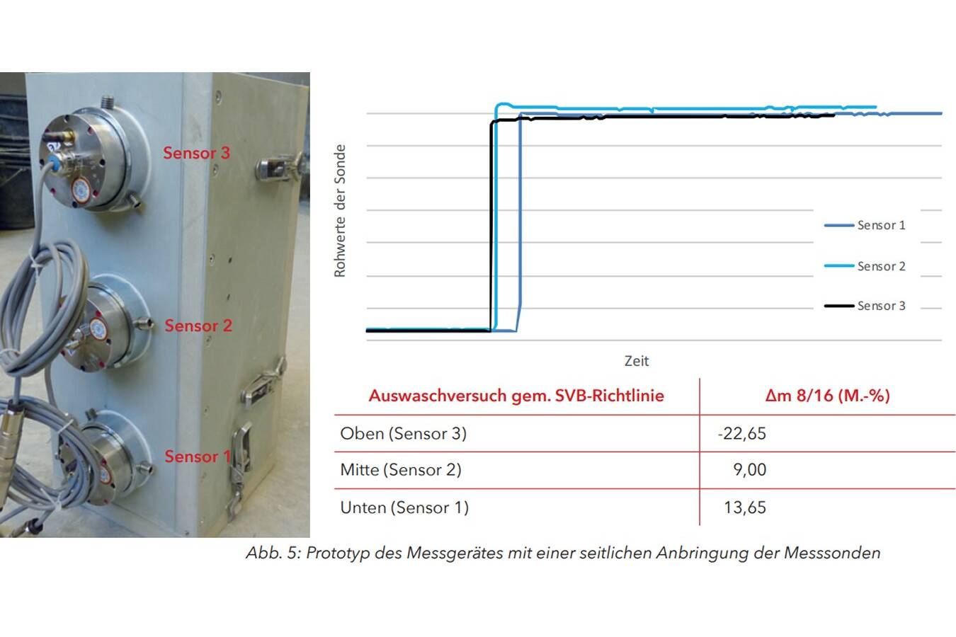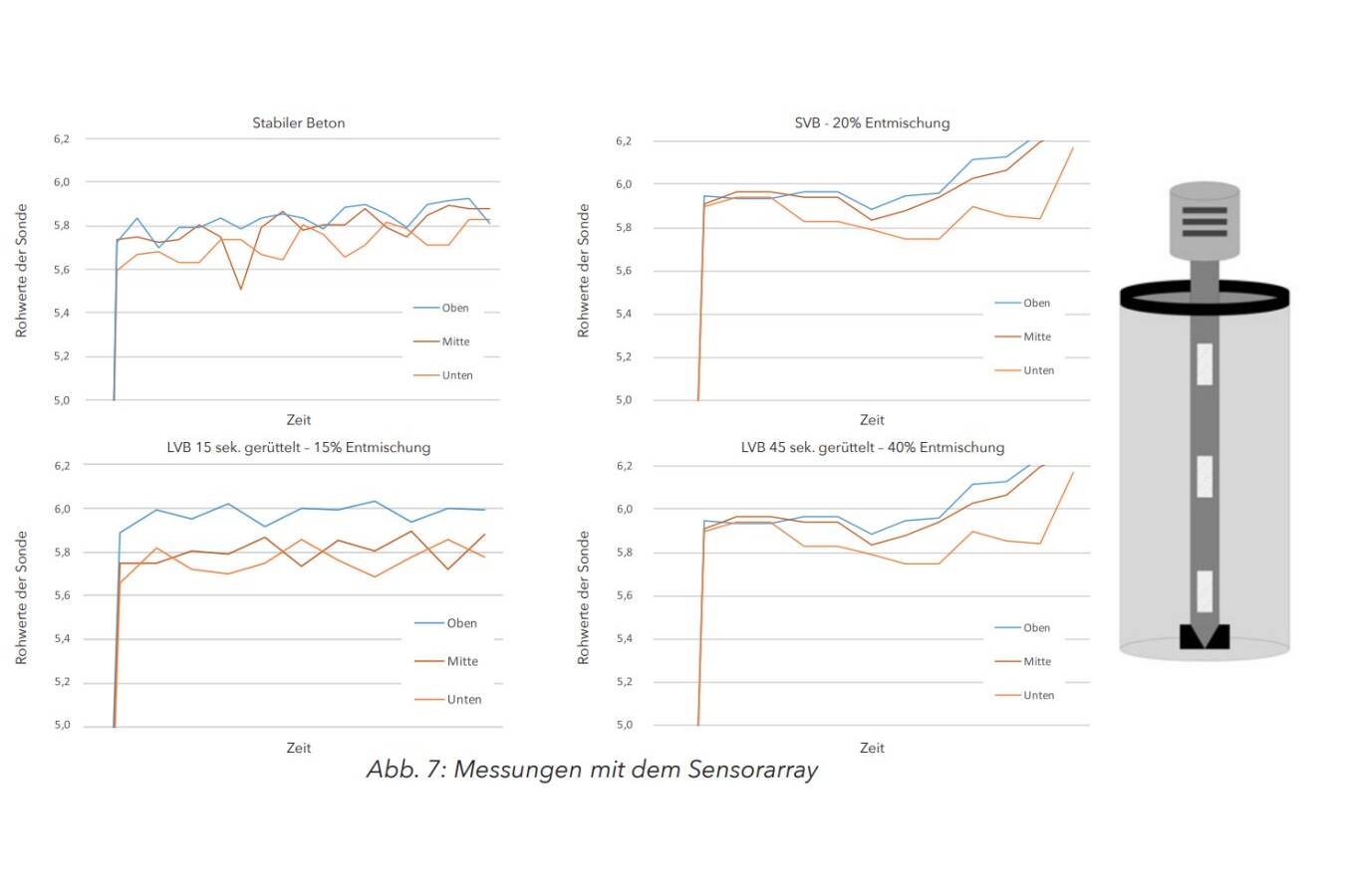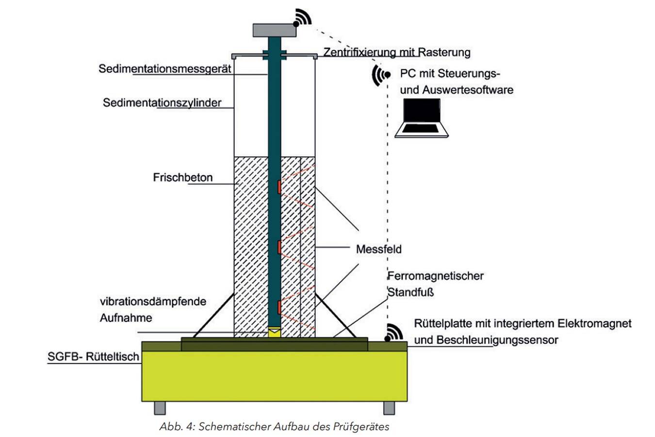 At the Institute for Construction Materials (IWB) at the University of Stuttgart, a sensor-based testing method is being developed to specifically examine soft concretes for sedimentation stability. Initial preliminary tests have already successfully confirmed the basic principle of the testing. The testing device, referred to as the ”Three-Cylinder Test,” involves filling a cylindrical mold with fresh concrete. A sensor array inserted into the center of the cylinder electronically records the sedimentation behavior , replacing the elaborate washing out of the three segments. Communication between the probe and the evaluation software is wireless.