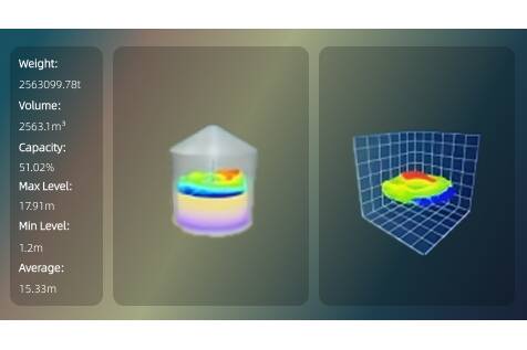 - AI-Driven 3D Volumetric Modeling; The massive point cloud data is processed via RETTAR’s proprietary AI algorithms to generate a high-fidelity 3D model of the grain surface. This achieves a volume accuracy of up to ±0.5% FS. The system integrates seamlessly with ERP and WMS via 4-20mA, RS485, or Ethernet, enabling fully automated inventory logs.