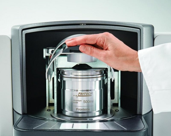 The grinding bowl is simply inserted in the PULVERISETTE 6 premium line from the front into the holder. Correct positioning is automatically ensured by a practical guide. The PULVERISETTE 6 premium line does not start until both bowls are correctly inserted and prevents due to bowl detection via RFID chip, the setting of too high speeds depending on the bowl material used.