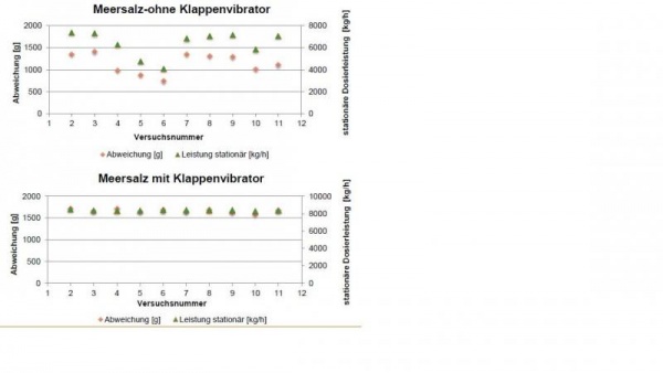 Vidos valves are specifically designed to prevent these bridges from forming. The valve’s disc vibrates horizontally by means of an adjustable frequency and amplitude. The operator is free to choose the opening range in which vibration is to be switched on and off. Energy consumption is extremely low and the amount of noise emitted is generally well below that generated by beaters, fluidisation systems or eccentric vibrators. There is effective protection against the medium compacting as the vibration only happens on the horizontal plane, i.e. axially in the direction of the valve shafts and not against the flow. Vidos valves can thus guarantee flexible regulation for a discharge volume across a very wide range. In terms of installation technology, no mechanical adjustments are required compared with a conventional valve. Existing signal cables can generally be used for the control technology. The dosing valves are arranged at same axis as the product being discharged from the silos. This allows, for example, silos or storage tanks to be placed directly above the scales or mixer, with no need to pump crosswise. In addition, the low installation height and the significantly lower investment costs have an impact on both the costs of system provision and subsequent costs for maintenance and operation (total cost of ownership, or TCO). The chart clearly demonstrates how using valves with a vibrator affects repeat accuracy. Provided that the input requirements are met, they also serve to homogenise the product flow as no material builds up on the edge of the opened valve disc during discharge at full flow. This increases performance while also virtually eliminating the disadvantages typical of an interfering contour (i.e. the valve disc in the product flow). This positive effect is particularly noticeable with ultra-fine powders, whose discharge performance can be as much as 30% higher. It is therefore possible to achieve the customary discharge volume using pipes with smaller cross-sections. The performance of existing systems can be improved without the need to spend a lot of time and money on upgrading them.