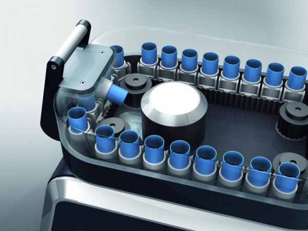 - Reliable complete sample feeding due to tilt function and programmable rinsing function with a strong spray jet