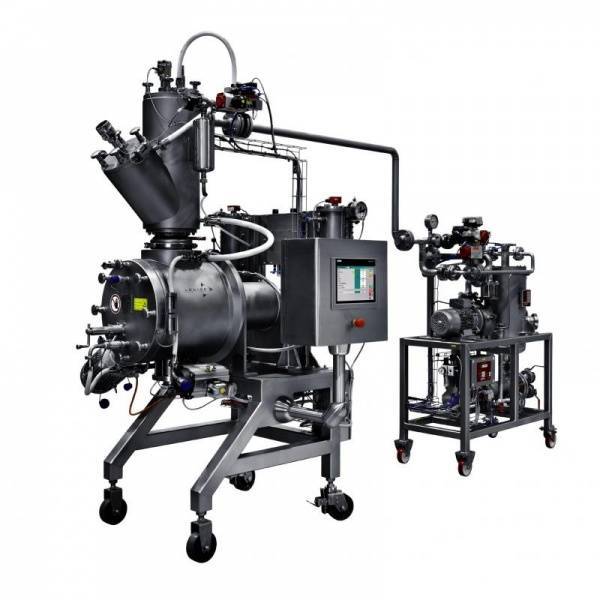 Whatever you want to produce, soups, paste or powder: the field of application with the All-in-One Process is large and there are nearly no limits. The design and size of the machine complies with the flexibility required in Research and Development: having a 50 litre mixing drum allowing filling degrees between 25 – 75 %, the unit is not only particularly compact, but also mobile. The machine, together with its periphery equipment (control cabinet, vacuum pump), are all placed on wheels for mobility within research facility.