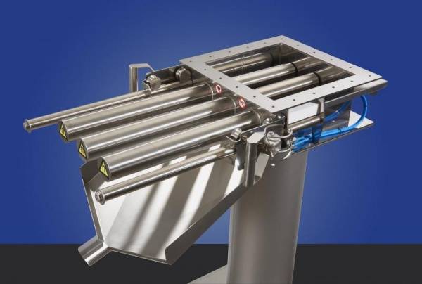 The Goudsmit Magnetics Group of Waalre (NL) introduces a new generation of magnetic separators. These are used to remove metal particles (>30 µm) from food like malt, rice, coffee, sugar, flour and cocoa. The Easy Clean flow magnet stands out from the competition due to its user friendly cleaning, improved flow and the high Gauss values of the bars. In contrast to previous designs, in which such magnets were fitted with two layers of thin (Ø25 mm) bars, the new design contains a single row of Ø50 mm thick bars. New measurement techniques, including simulations of magnetic fields and tests in the company’s own test centre, have shown that this results in a higher separation yield. This is because the thicker bars remain in contact with the magnetic particles longer. An additional benefit is the reduced height of the magnet as a whole, which means it requires less installation height. Moreover, a single row of bars results in improved product flow; which is particularly beneficial when it comes to poorly flowing powders.