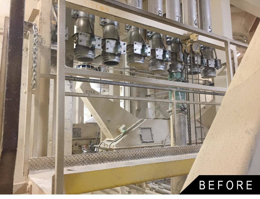 The client used a manual hose switching station to route materials from the main supply line into each silo individually. The manual hose switching station presented many disadvantages, including: