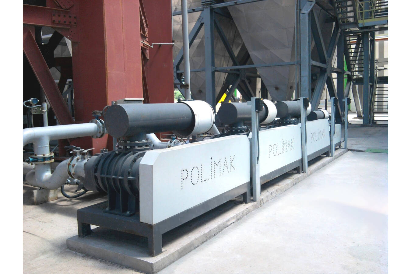 The pneumatic conveying system transfers the collected dust from filter or cyclone hopper to silo. Rotary valves are installed below each bag filter hopper. A pneumatic conveying pipeline is installed below rotary valves and collects the dust coming from hoppers. Pressurized supplied from roots type blower is used to transport the dust to the silo through the pipeline. A reverse jet pulse filter is installed above the silo to discharge the pressurized air and keep the conveyed dust inside the silo. Depending on configuration several bag filters, dust collectors can be connected to the same pneumatic transport line. The system can be designed to run by pressurized air or vacuum air.