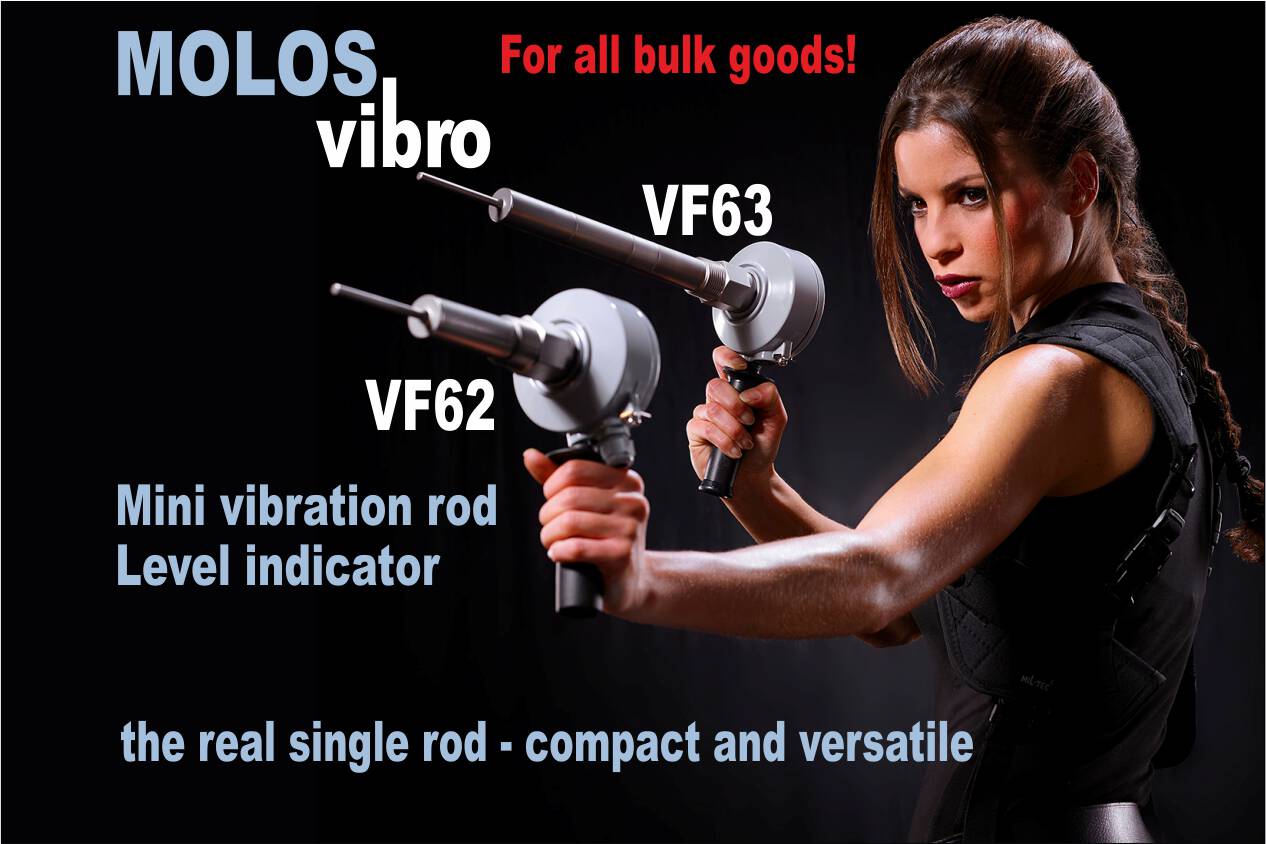 The MOLOSvibro level indicator VF6. is even under extreme process conditions suitable for full, demand or empty detection in bins or containers for powdery, granulated and grained bulk goods with a minimum density of 0.02 t/m³. The very compact design allows a reliable level indication even with limited mounting space. This measuring device for limit level detection is available as compact sensor, rod extension sensor and suspension cable sensor.