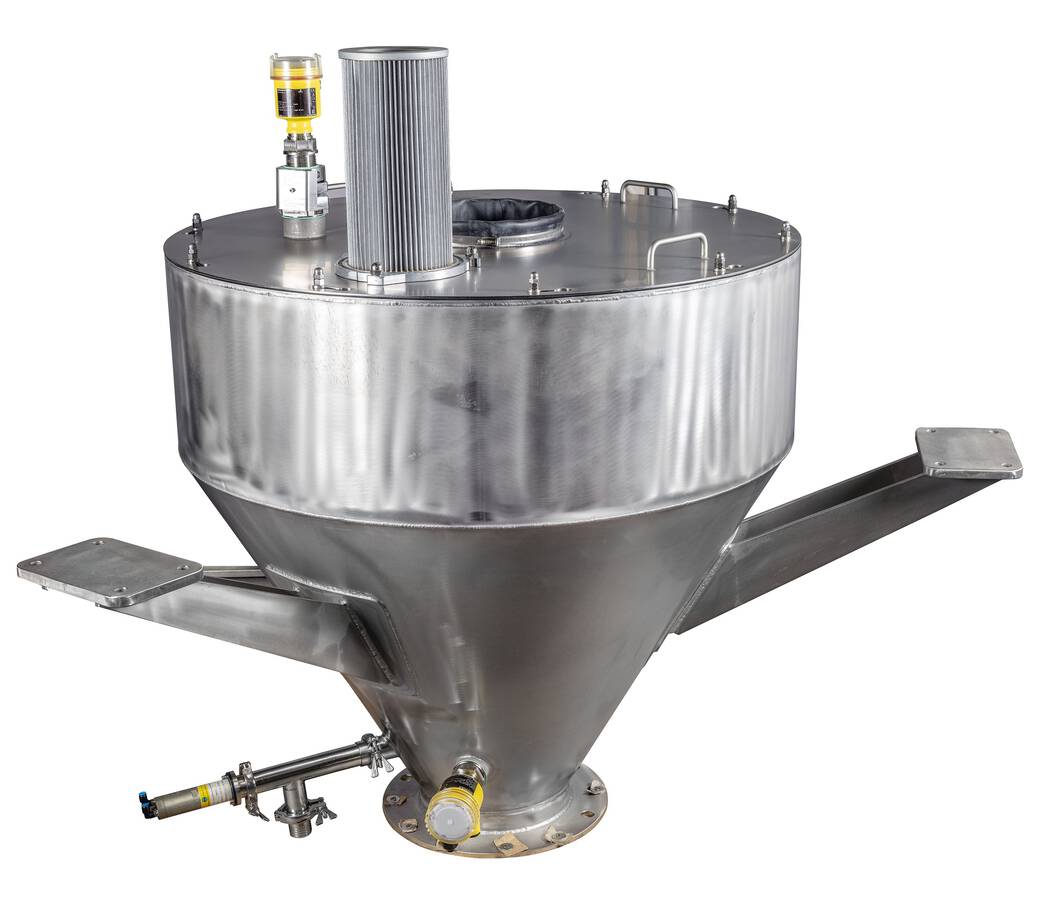 The collection container is equipped with two level indicators which monitor the minimum and maximum level. Here too, it was important to the operator to be able to adapt the equipment to various products and process properties. Because these are also spread around the container in different ways. In the case of dry, easy-to-pour products, measurement of the level is unproblematic, because they accumulate in an even material column in the container. With products with less favorable flow properties, measurement is somewhat more difficult, because they form steeper or flatter debris cones under the inlet. The ambient temperature also influences the behavior of a bulk solid. For the full indicator, the operator therefore decided to have an oscillating fork with tube extension, in which the fork can be fastened to any desired point on the tube. In addition, the collection container is equipped with a screw sampler. This makes it possible for the operator to remove samples from the ongoing product flow. The dusty air displaced by the product flow can escape out through a dust extraction filter.