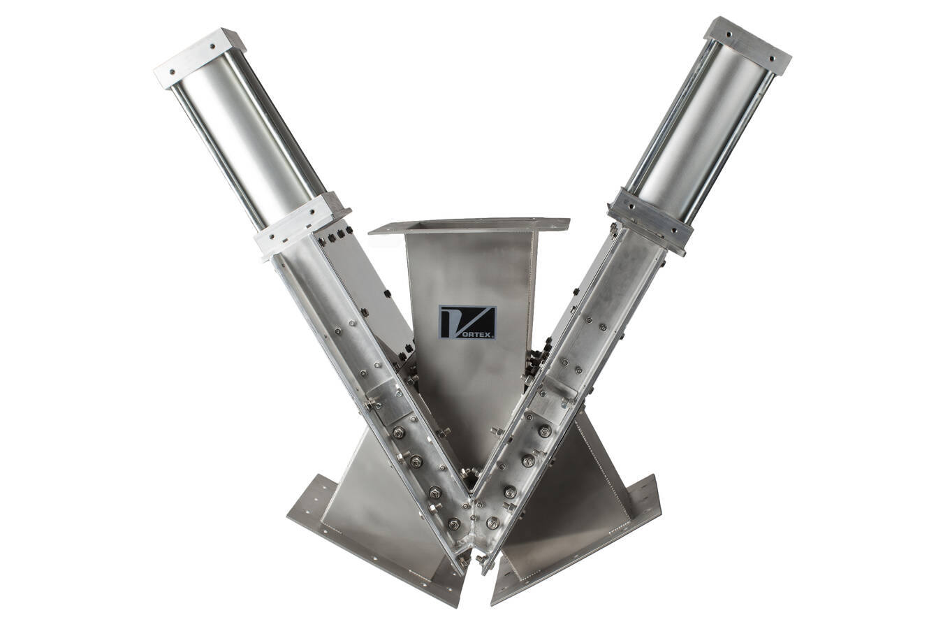 In this application, Trona Ore is routed through various processes where it becomes soda ash and baking soda. Titan Gravity Vee Diverter features a dual cylinder design where pneumatic cylinders are located on either side of the outlet instead of one cylinder at the end of the gate. This design shortens the gate’s overall length, allowing for easier installation in tight quarters.