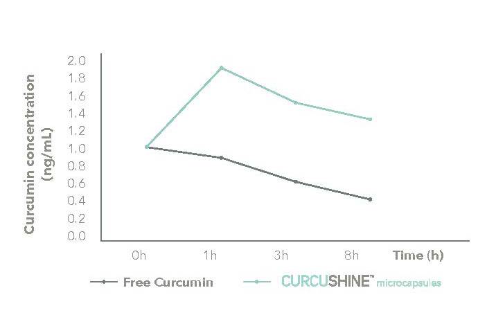 The bioavailability of the produced particles was first evaluated in vitro and confirmed in macrophages (specialised cells involved in the immune response, J774A.1), an immortalised cell line formed from human liver carcinoma cells (HepG2) and human colorectal adenocarcinoma cells (Caco2) that simulate the intestine (Figure 3). This data was then confirmed in an in vivo study, during which a panel of healthy volunteers ingested 750 mg of turmeric extract and the equivalent delivered in Curcushine microcapsules; the results showed a two-fold increase in bioavailability and sustained release during a period of 8 hours (Figure 4).