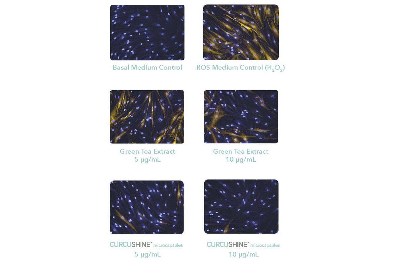 The commercial preparation, Curcushine, was also tested for its ability to counteract the detrimental effect of reactive oxygen species (ROS) on skin cells (compared with a green tea extract, a well-known antioxidant) and found to be much more effective (Figure 5).