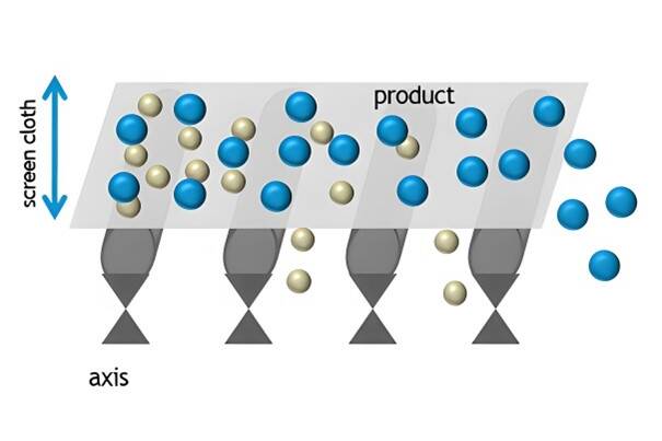 The material on the screen is thrown up from the screen mesh in right angles by a high frequent vibration of only screen mesh. For the screen type RHEsono® the vibration is generated by robust electromagnetic vibrating heads mounted outside of the machine, for the screen type RHEmoto® by small out-of-balance motors. Vibrations are transferred to the screen mesh by swiveling axes. At the screen mesh it accelerations up to 15 g and more can be achieved (1 g ≈ 9.81 m/s2). Due to the inclination, the transportation speed of material on the screen is very high, thus enabling a low product layer at high feed rates. Compared to inclined screens with linear movement, this type of machine is advantageous due the direct excitement of the screen cloth. This helps to disperse the material and to prevent the mesh from clogging efficiently due to the high forces impinging the product. Additionally, an automatic cleaning cycle can be set to increase the forces to a maximum periodically, resulting in highly efficient anti-clogging.