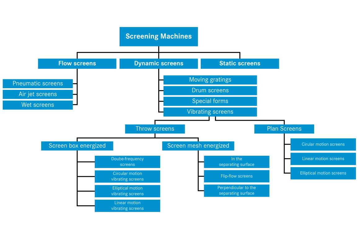 To compare screen efficiency, screening machines with a vibrating base body—such as linear vibrating screens, double frequency screens, flat screens with circular thrust movements, and elliptical vibrators (collectively referred to as indirectly driven screening machines)—are compared with directly excited screening machines, where only the screen mesh vibrates.